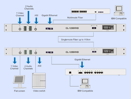 The CL-1250VHD multiplexes a Gigabit Ethernet (GIG-E) transceiver with a Video/Audio Multiplexer. The Video/Audio multiplexer may be configured for one baseband video and 2-8 channels of audio and one high speed data channel, such as SDI or DVB-ASI or HD-SDI. The CL-1250VHD can be configured to transmit over one or two fibre strands. It has easy-to-read diagnostic LED's for continuous status reports on network speed, duplex media access control connection, and network traffic. The CL-1250VHD uses standard SC or SC/APC fibre optic connectors and is IEEE 802.3z 1000BASE-FX compliant and operates with all devices that adhere to this standard.