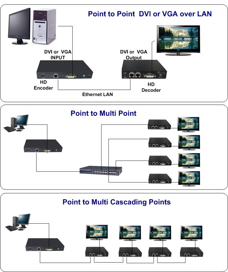 The CL-DVI2IP unit is a High Definition Video/Audio over IP transport system for DVI or VGA signals. With this unit you can stream an DVI or VGA signal to anywhere in the world over the Internet or other IP based Ethernet network. Our CL-DVI2IP encoder features H264 encoding which uses less than half the bandwidth of MPEG-2. The CL-DVI2IP unit offers broadcast quality encoding with a low time delay, typically around 200 ms. The unit features an integrated web server for remote management and monitoring. The CL-DVI2IP system is perfect for anyone who wants to transport or multicast a DVI or VGA source.
