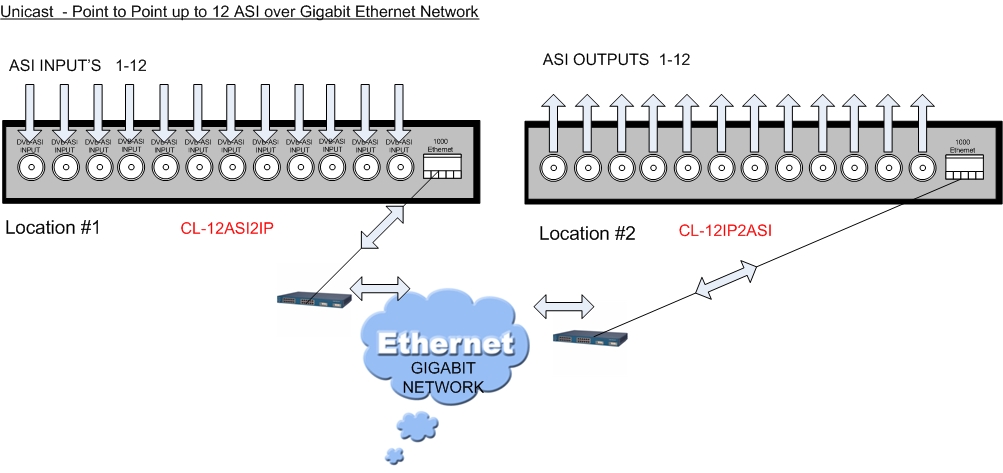Together with CL-12IP2ASI it can a create link over the Gigabit Ethernet network, for transporting 12 independent DVB-ASI transport streams from place to place .