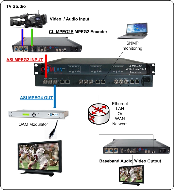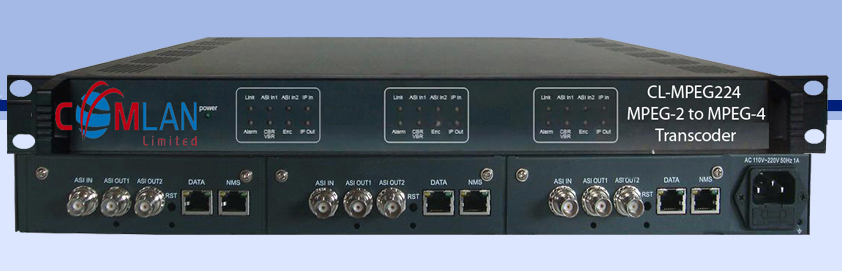 Sometimes when working with Video transport streams it is necessary to reduce the bandwidth. A common approach to this problem is to convert MPEG-2 Video to MPEG4. MPEG-4 AVC/H.264 is an encoding system that uses much less bandwidth than the older MPEG-2 encoding sceme. The CL-MPEG224TR is a professional SD TS Transcoder Device that takes an incoming MPEG2 transport stream and transcodes it to MPEG-4. The unit has 1 ASI Input Interface and 2 mirrored ASI Outputs, and it supports MPEG-2 Encoding format transcoded to MPEG-4 AVC/H.264. The Transcoding processes is completely digital so there is little loss in image quality. There is no digital to analog or analog to digital conversion of any kind. This device can also de-multiplex 1 program from the input MPTS (Multi Program Transport Stream) and Transcode the program from MPEG-2 to MPEG-4 AVC/H.264. The unit can also work completely with IP inputs and outputs. The Transcoder operations are controlled and monitored via Network Monitoring Software.