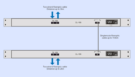 CL-155 is a Fast Ethernet, FDDI, OC-3 or ATM mode converter that translates transmission signals from a multimode optical signal to a singlemode optical signal. CL-155 can be configured to transmit over one or two fiberoptic strands. CL-155 expands LAN network data transmission distances beyond the 2km limitation of multimode fiber to a maximum of 110km over singlemode fiber. Fast Ethernet requires full duplex for extension beyond 2km. CL-155 has easy-to-read diagnostic LED's for continuous status of LAN and WAN system status.